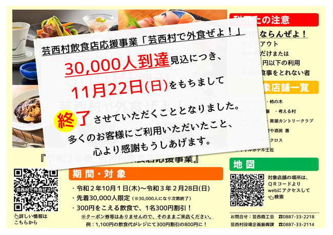 芸西村飲食店応援事業「芸西村で外食ぜよ!」は11月22日をもって終了させていただくこととなりました。