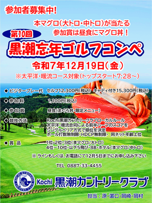 12/19(金) 第10回黒潮忘年ゴルフコンペのお知らせ 2025年10月30日 2025年12月19日(金) 第10回 黒潮忘年ゴルフコンペが開催されます! お申し込みの際はライン、もしくはお電話にて〈12月5日までに〉ご連絡くださいませ。