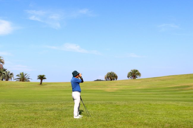 グリーンや池に向かっての傾斜のチェック?😊