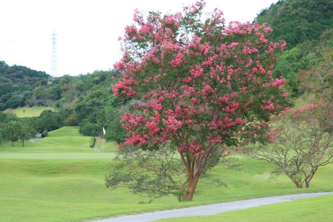 こんにちは😄 🐳かんくろうです。暖流コース4番 グリーン奥⛳百日紅の花をご紹介します😉夏の長雨の影響で今年はイマイチの見栄えですが😅プレー中の心を和ませてくれると思います🤗皆さまのご来場をお待ちしております😁……